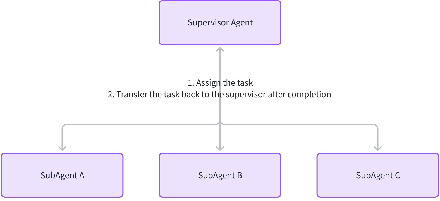 Supervisor Agent is a centralized multi-agent collaboration pattern composed of one supervisor and multiple subagents. The Supervisor assigns tasks, monitors subagent execution, aggregates results, and decides next actions; subagents focus on executing their tasks and, when done, automatically transfer control back to the Supervisor via WithDeterministicTransferTo.