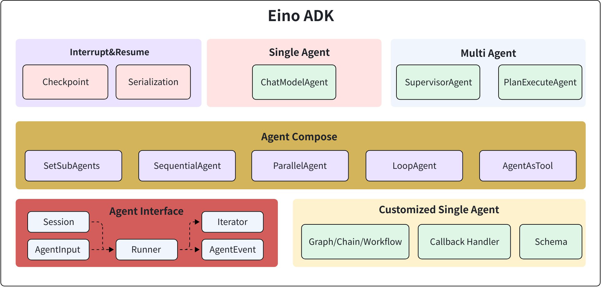 Eino ADK, inspired by Google ADK, is a flexible Go framework for building Agents and Multi‑Agent applications. It standardizes context passing, event streaming and conversion, task transfer, interrupts & resume, and cross‑cutting aspects. It is model‑agnostic and deployment‑agnostic, aiming to make Agent and Multi‑Agent development simpler and more robust while offering production‑grade governance capabilities.
