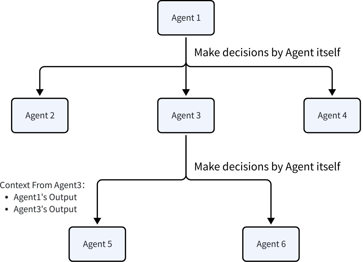 | Autonomous | Inside the Agent, choose downstream Agents as needed (often via LLM). Even if decisions are based on preset logic, from the outside this is treated as autonomous. |