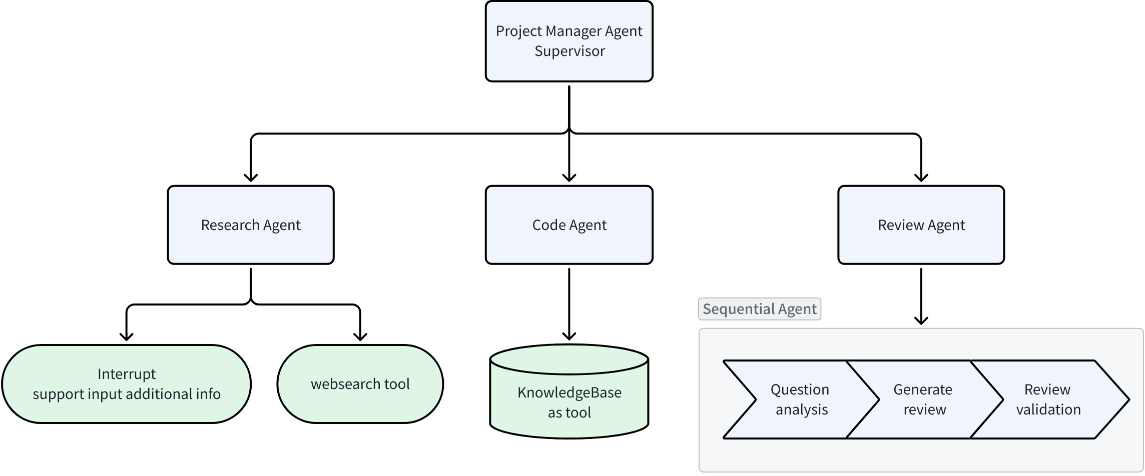 - ReviewAgent: sequential workflow (analyze → generate evaluation → validate) to review research/code and provide reasoned feedback